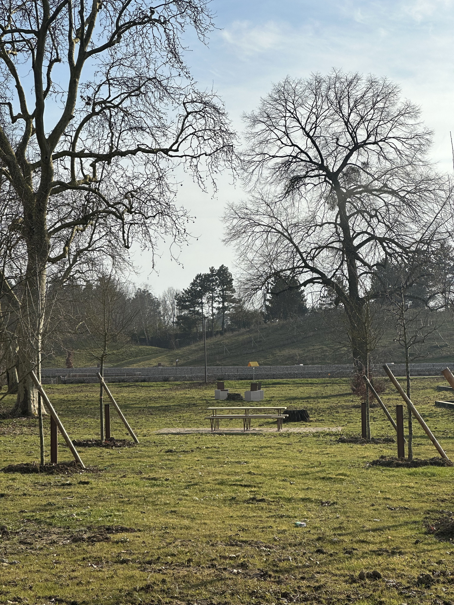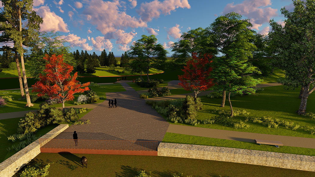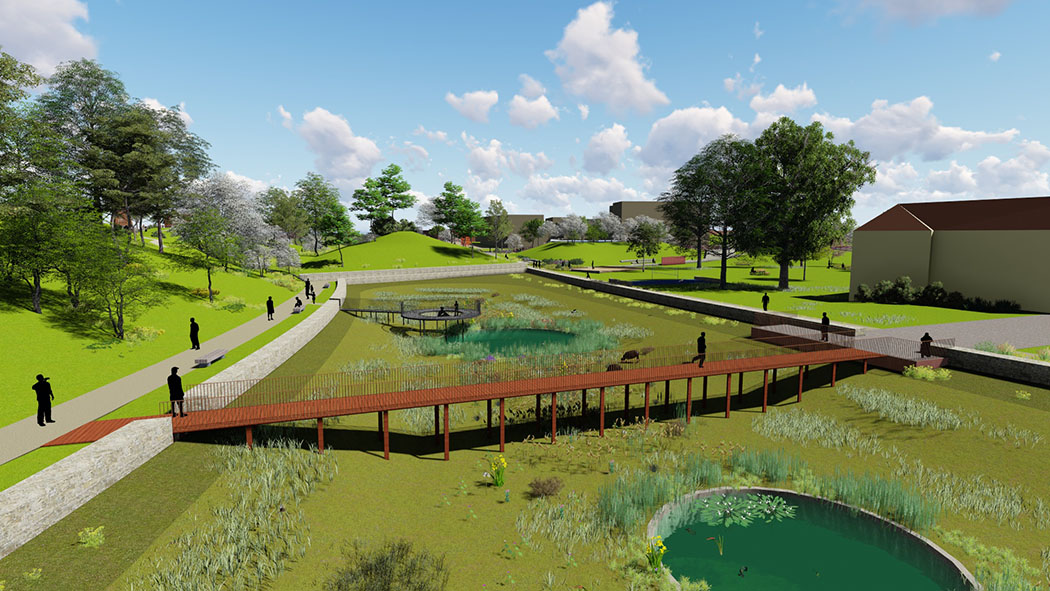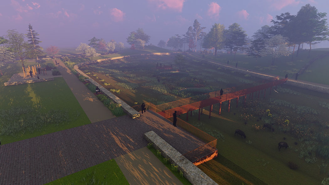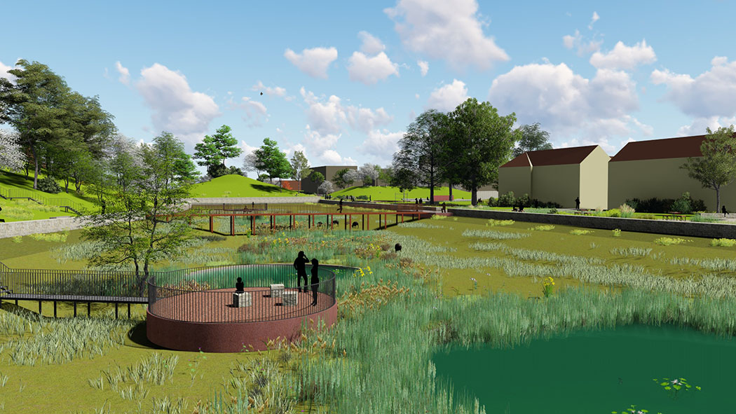 Le relief a été sculpté pour remodeler un paysage cohérent, qui met en valeur son patrimoine historique et de ses retenues d’eau. Le grand talus existant, trace de l’ancien échangeur routier, a été remodelé pour ouvrir l’axe ferme/ Lac et recréer une échappée visuelle. Entre histoire nourricière de la ferme et culture nourricière contemporaine… un parc qui se veut lieu de cultures, de sculpture (du sol) et de créativité.