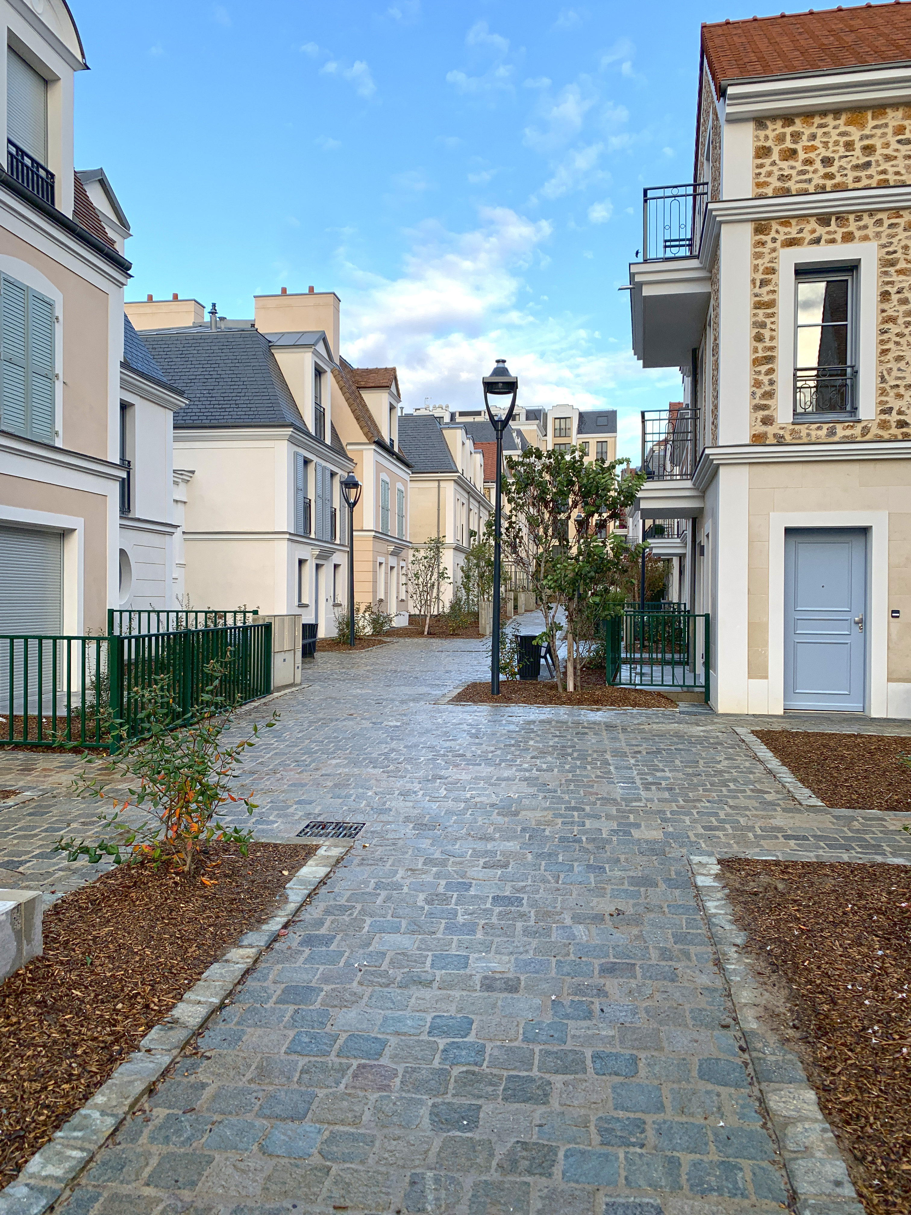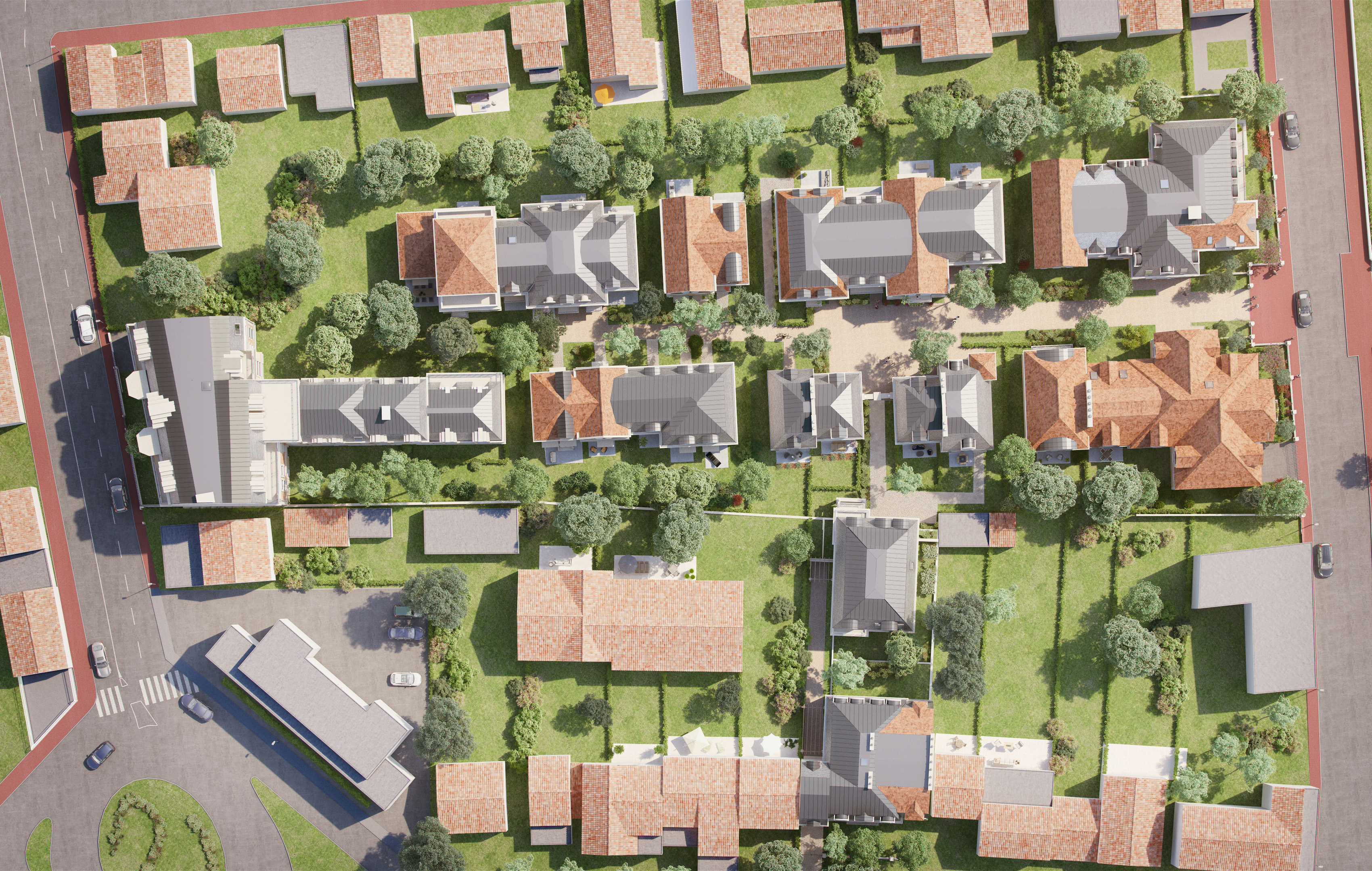 Une lisière arbustive et buissonnante vient envelopper le site, et se décline en arbustes à caractère forestier et champêtre. Un axe central structuré par une grande allée plantée et piétonne, permet de desservir les différentes terrasses et plateaux d’habitation. Dans les jardins privés, des arbres fruitiers palissés viennent créer l’identité du lieu. Poiriers verriers, pommiers et pêchers en palmettes structurent les jardins et offrent leurs fruits gourmands aux cueilleurs.