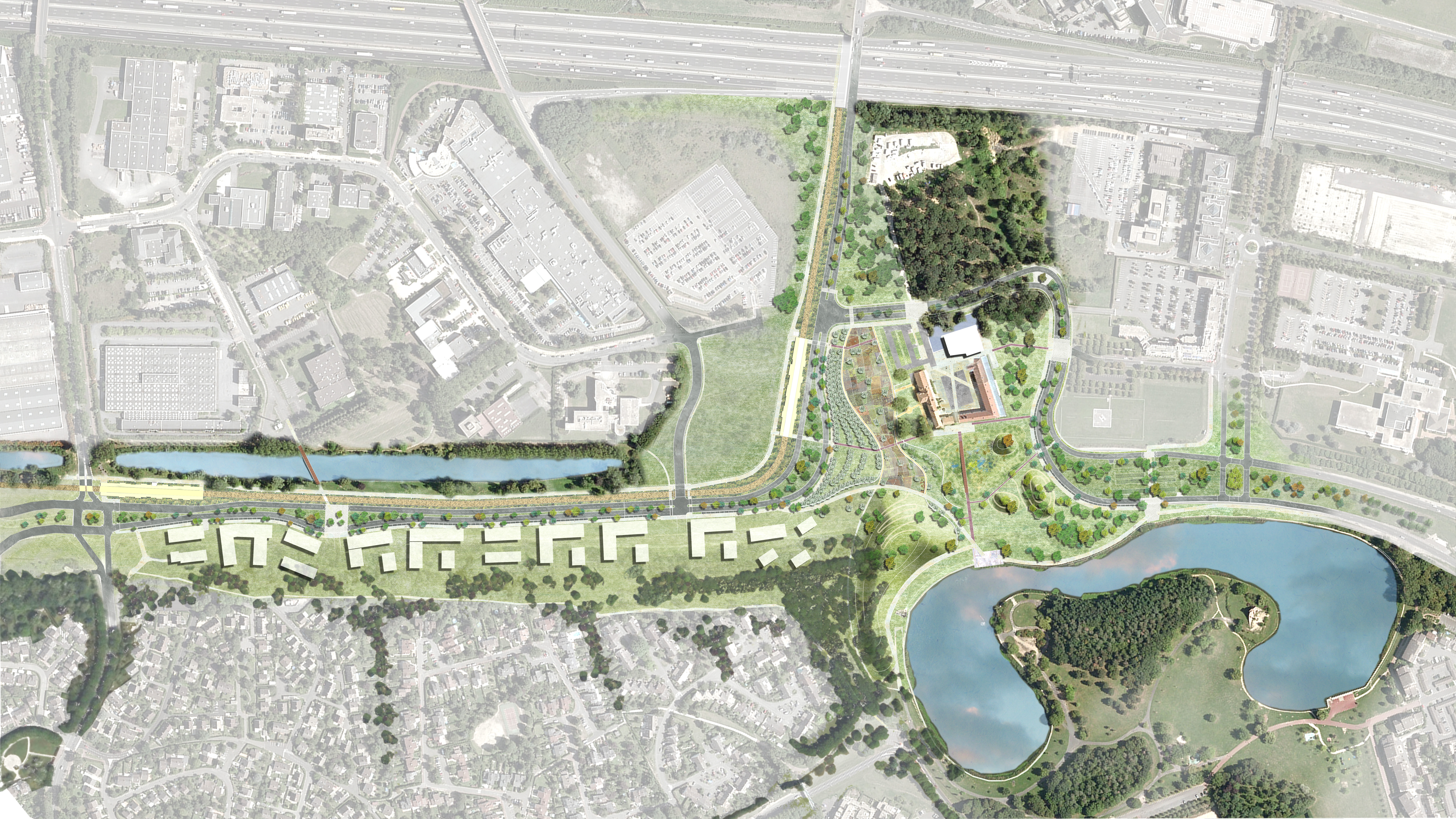 L’empreinte des infrastructures routières (D446) a généré des coupures urbaines et écologiques importantes. Le projet prévoit la création d’un boulevard urbain, véritable colonne vertébrale verte, évoluant selon les espaces traversés. Il accompagne le canal et les habitations futures, articule la gare, le lac et la Ferme. Il permet l’accroche avec le reste du réseau routier et le paysage attenant.
