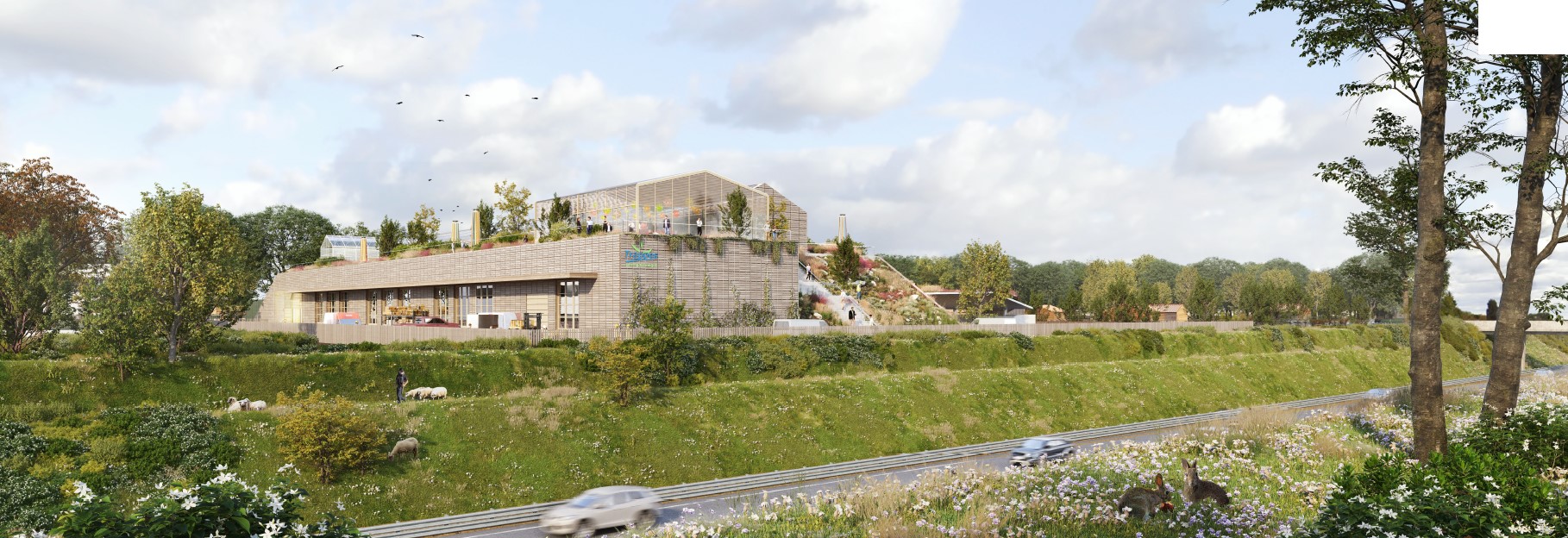 Le paysage qui accompagne le nouveau CTM présente une relation forte avec le bâtiment. Les façades de bardage bois s’infléchissent jusqu’au sol et semblent l’inviter à l’escalader, à s’élever. Le bâtiment devient modelé de sol pour accueillir ce paysage…Deux versants sur les pignons Est et Ouest du bâtiment guident donc le sol vers les hauteurs, et le bâtiment se fait socle pour ces jardins suspendus.